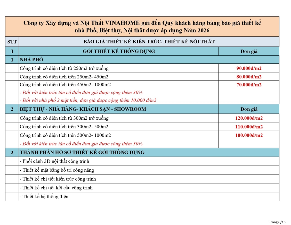 Dưới đây là bảng báo giá thiết kế kiến trúc và thiết kế nội thất và các công trình Nhà phố, Biệt thự, Nhà hàng, Khách sạn... của công ty Xây dựng và nội thât VINAHOME