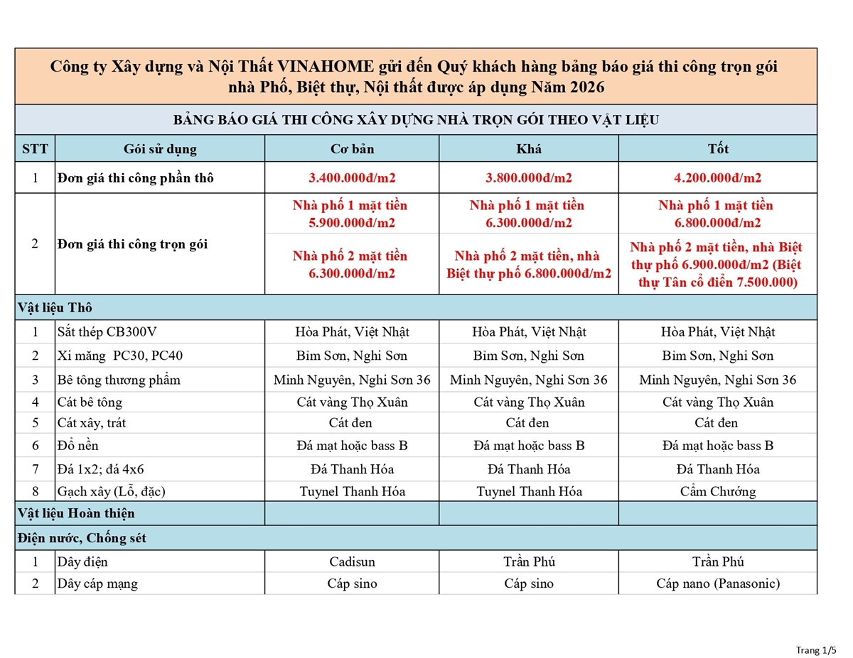 B. BÁO GIÁ CHI PHÍ THI CÔNG XÂY DỰNG NHÀ TRỌN GÓI NĂM 2026